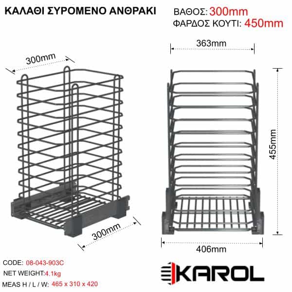 Μεταλλικό συρόμενο καλάθι μπάνιου ή κουζίνας για άπλυτα ρούχα σε ανθρακί απόχρωση και σε διάφορα μεγέθη ώστε να καλύψετε κάθε ντουλάπι που μπορεί να έχετε. Το συνολικό ύψος του καλαθιού είναι 45,5cm. Διαθέτει τηλεσκοπικό μηχανισμό πλήρης επέκτασης με μέγιστο φορτίο 45kg. Τα καλάθια είναι ήδη μονταρισμένα και έτσι η τοποθέτηση τους είναι πολύ εύκολη και γρήγορη. Είναι ελληνικής κατασκευής και έχει μεγάλη αντοχή στον χρόνο!