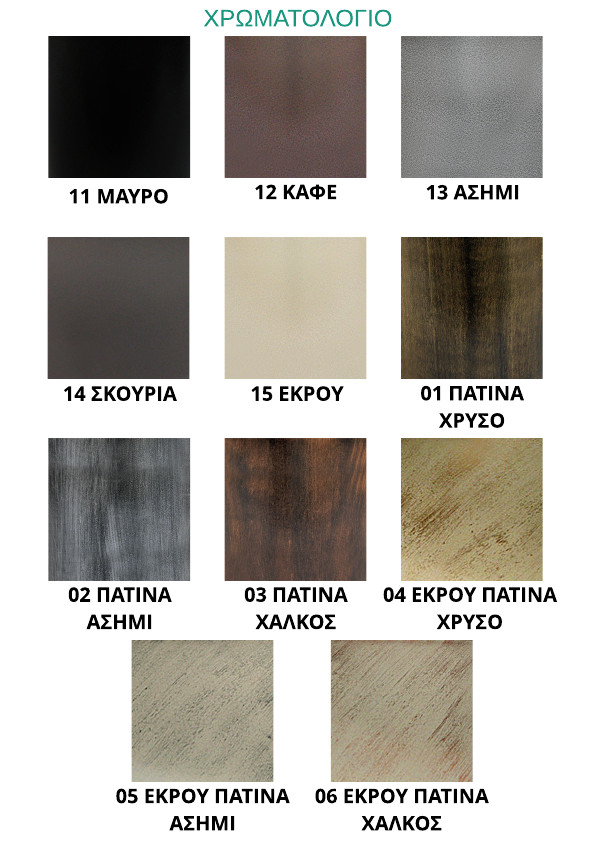 Επίσης μπορείτε να κάνετε επιλογή ανάμεσα σε 11 διαφορετικά χρώματα τα οποία είναι: Μαύρο, Καφέ, Ασημί, Σκουριά, Εκρού και Πατίνα Χρυσή, Πατίνα Ασημί, Πατίνα Χαλκός, Εκρού Πατίνα Χρυσό, Εκρού Πατίνα Ασημί, Εκρού Πατίνα Χαλκός.